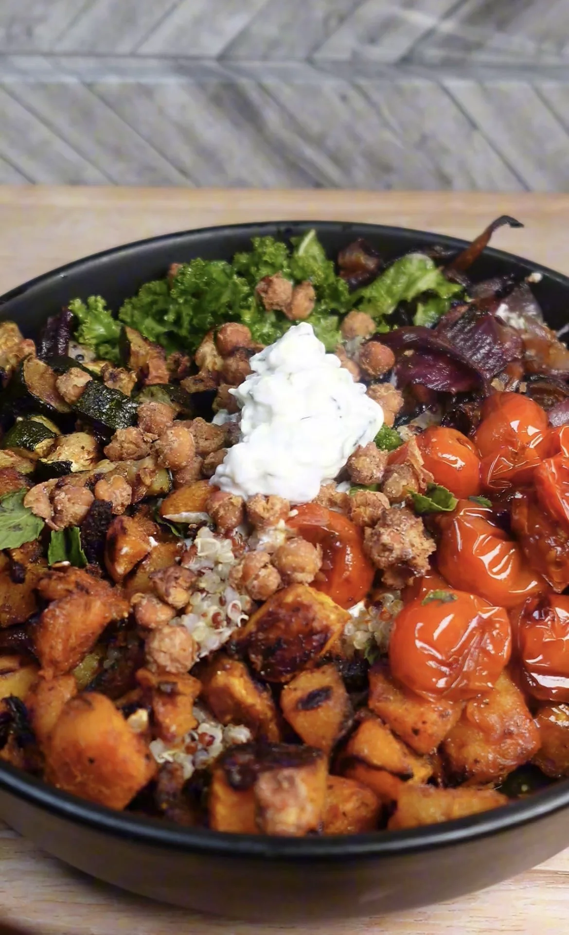 Assemble bowls: Layer quinoa, kale, roasted veggies, and crispy chickpeas. Top with tzatziki or tahini if desired. Serve warm.